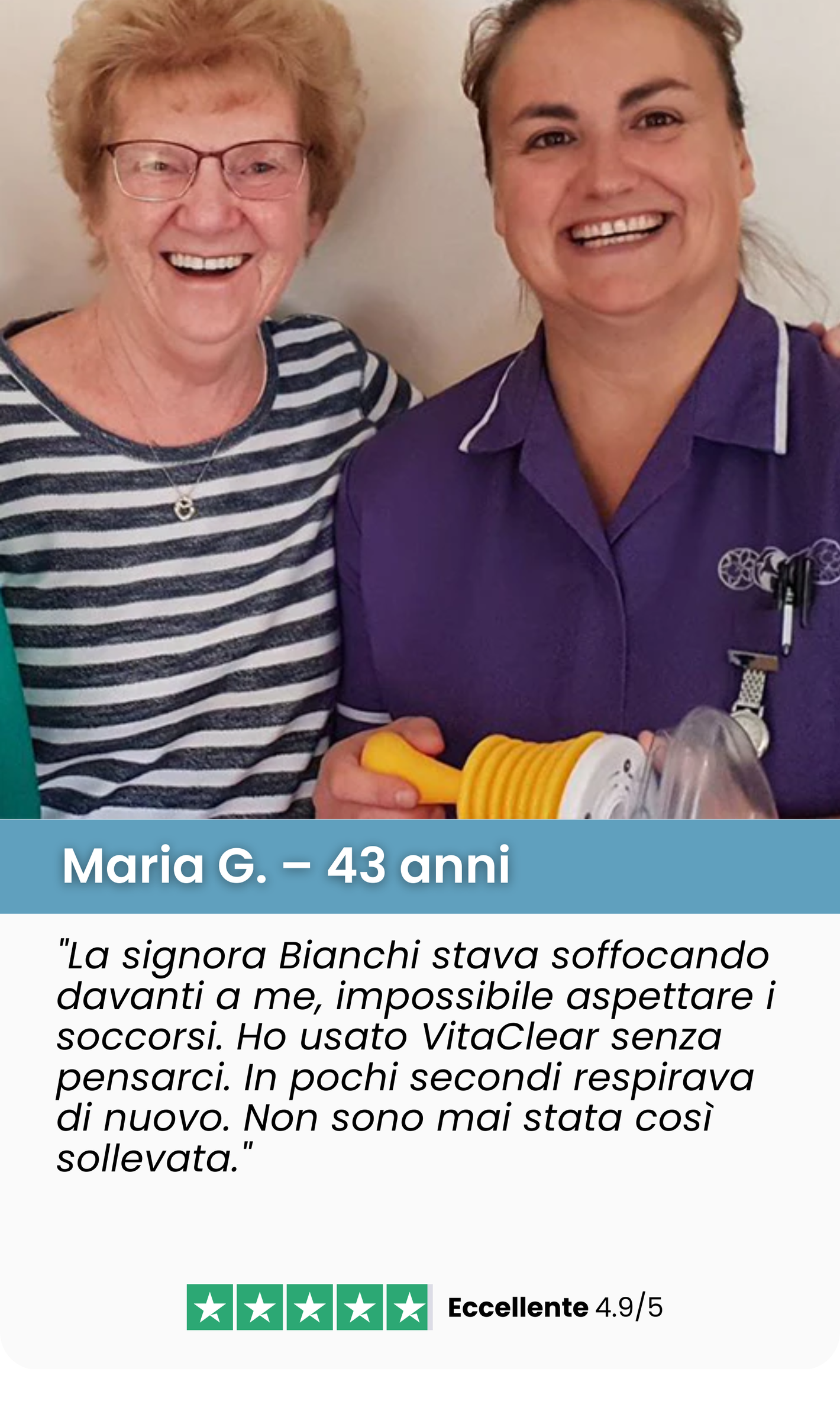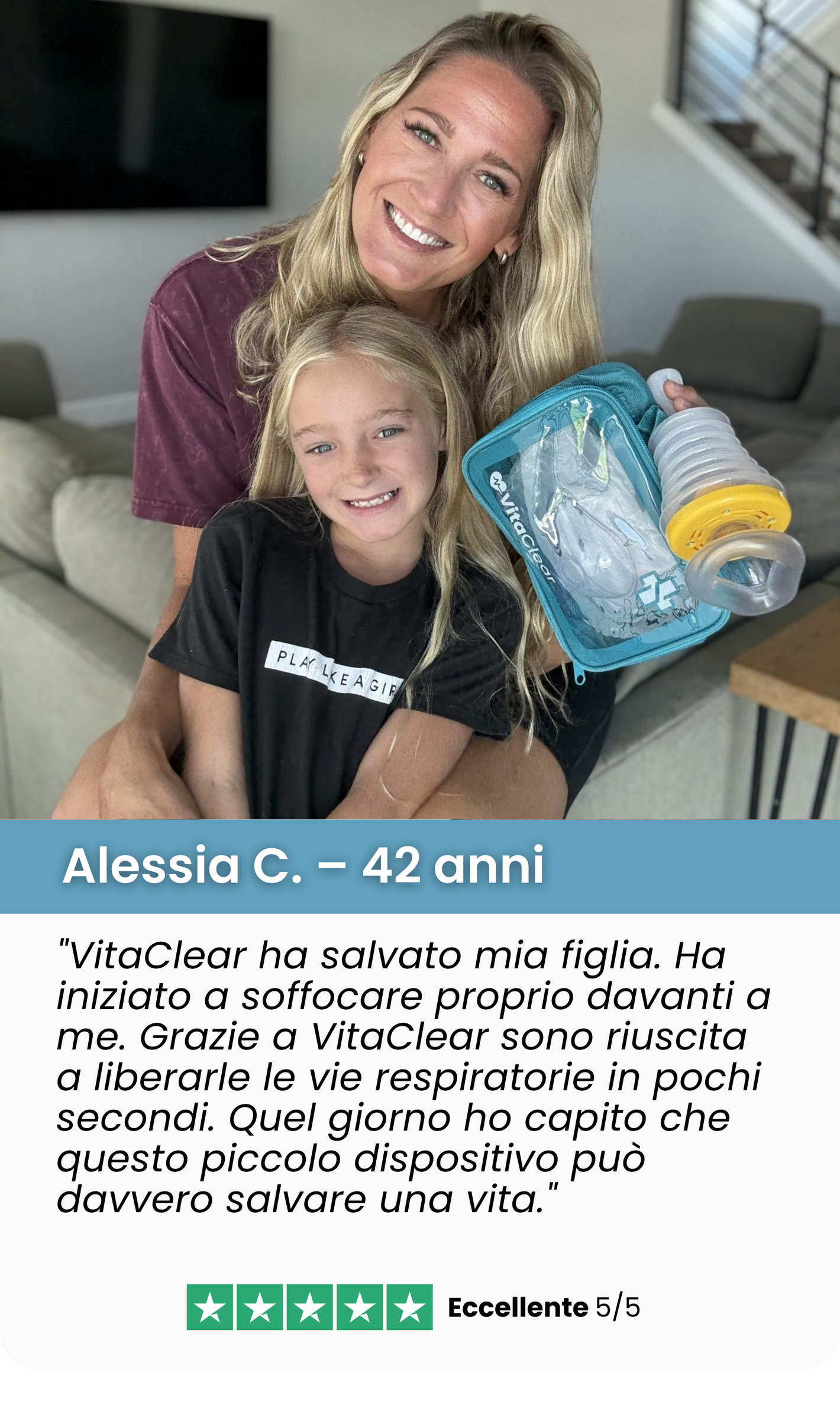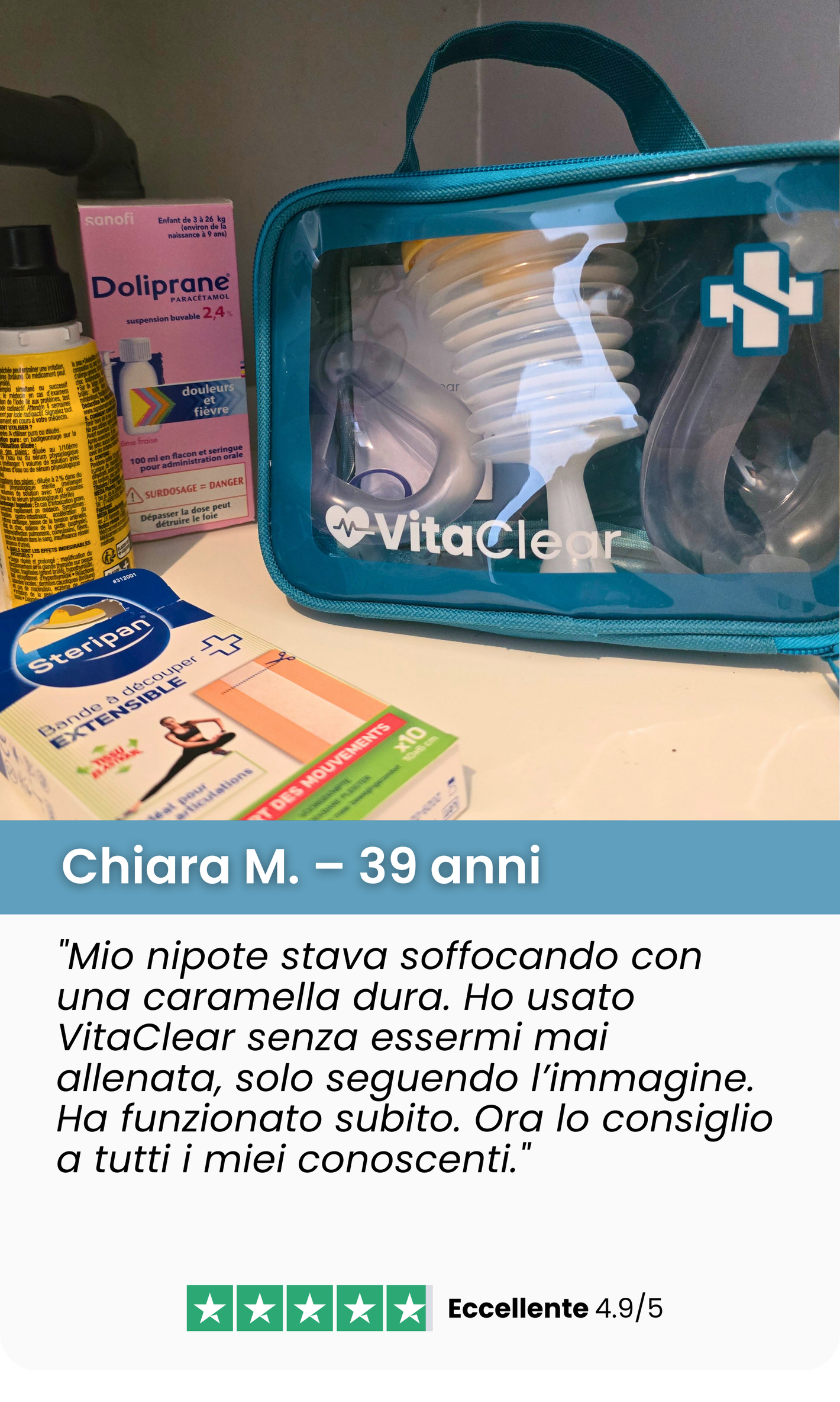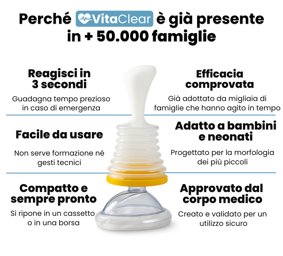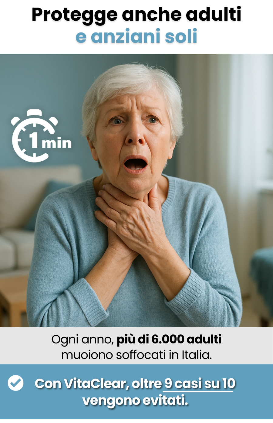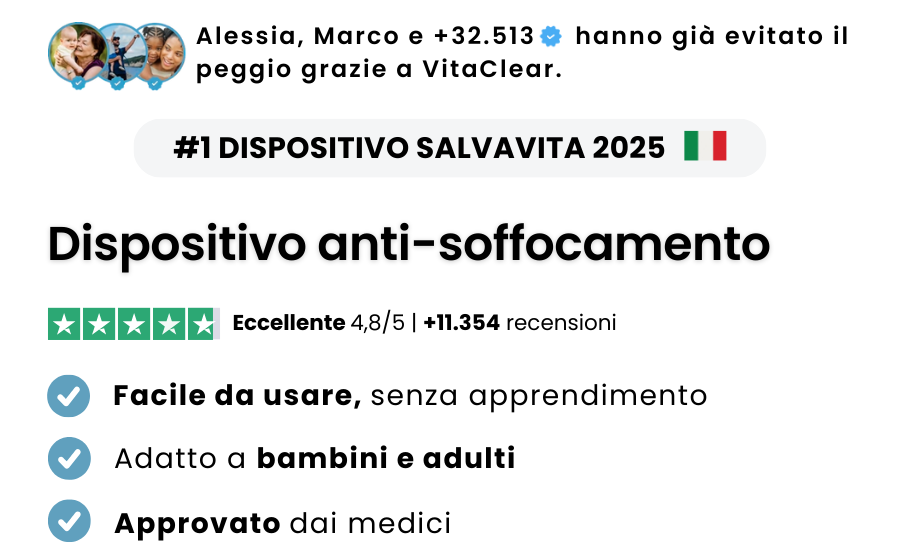 La manovra di Heimlich fallisce in circa il 30% dei casi. VitaClear agisce in meno di 3 secondi con un tasso di successo del 98%, anche quando le manovre classiche non funzionano.