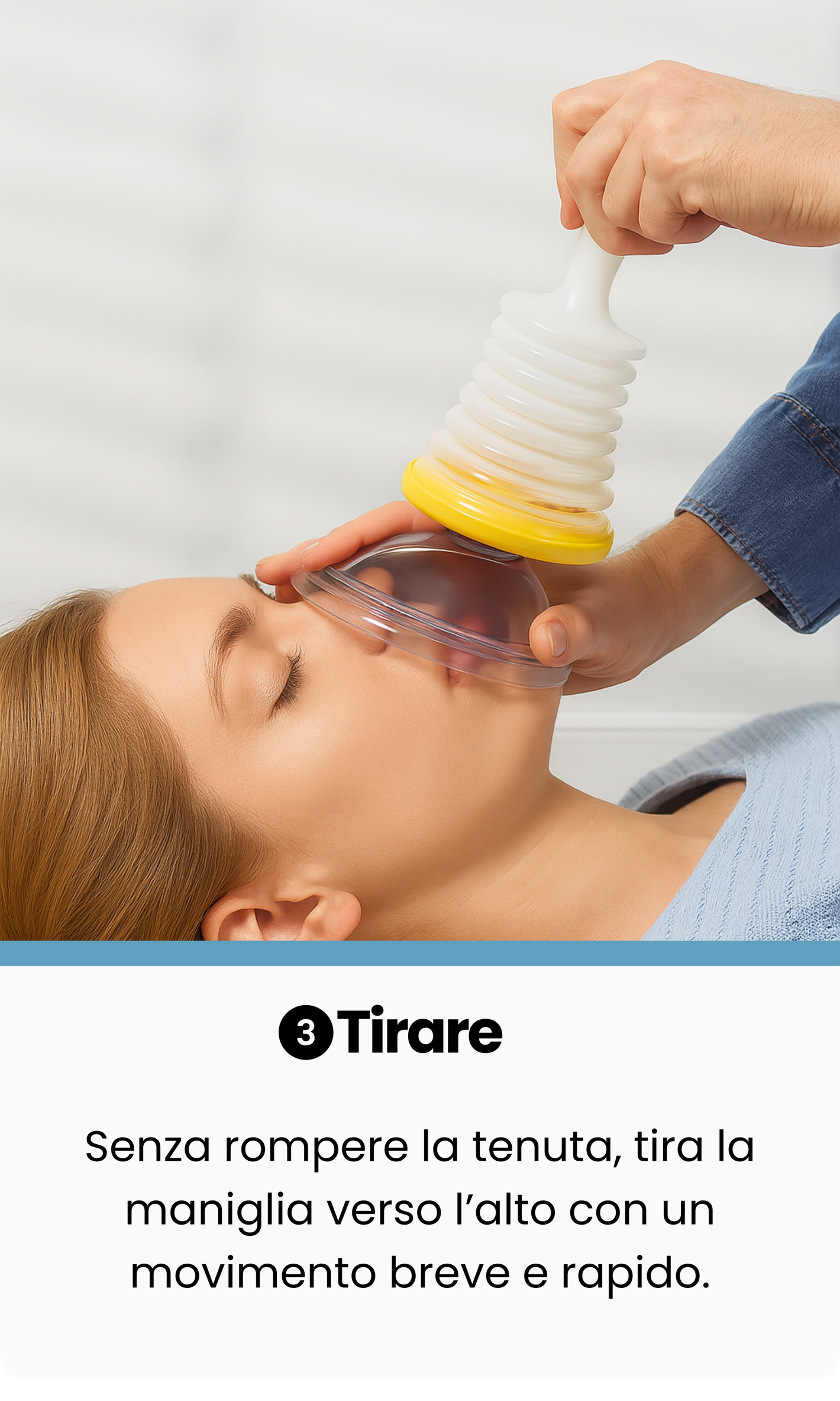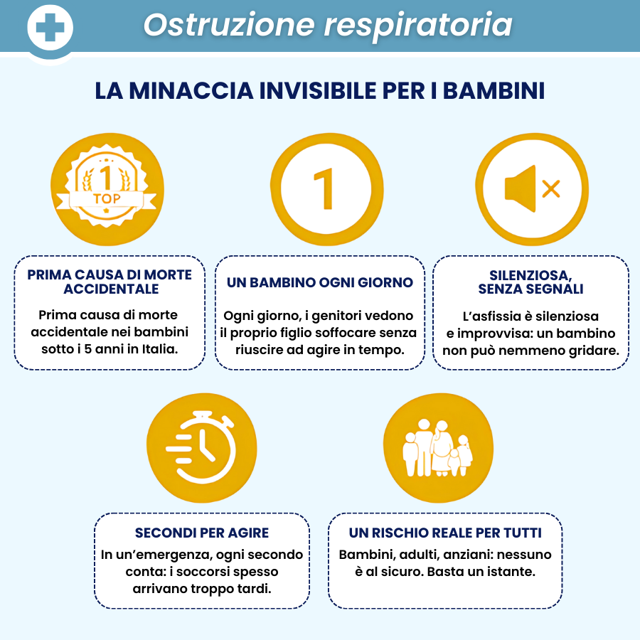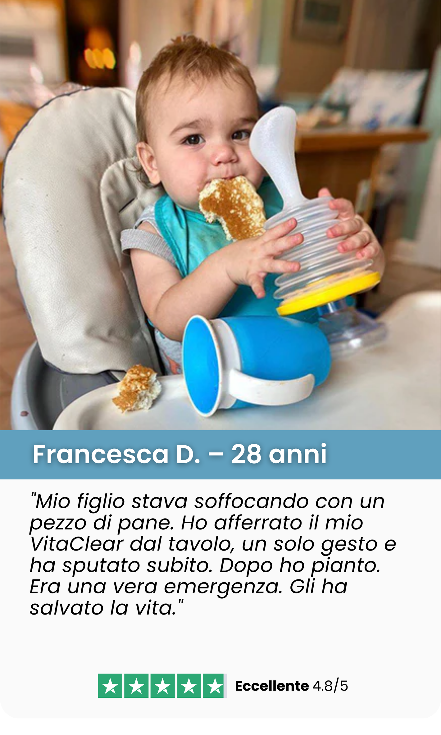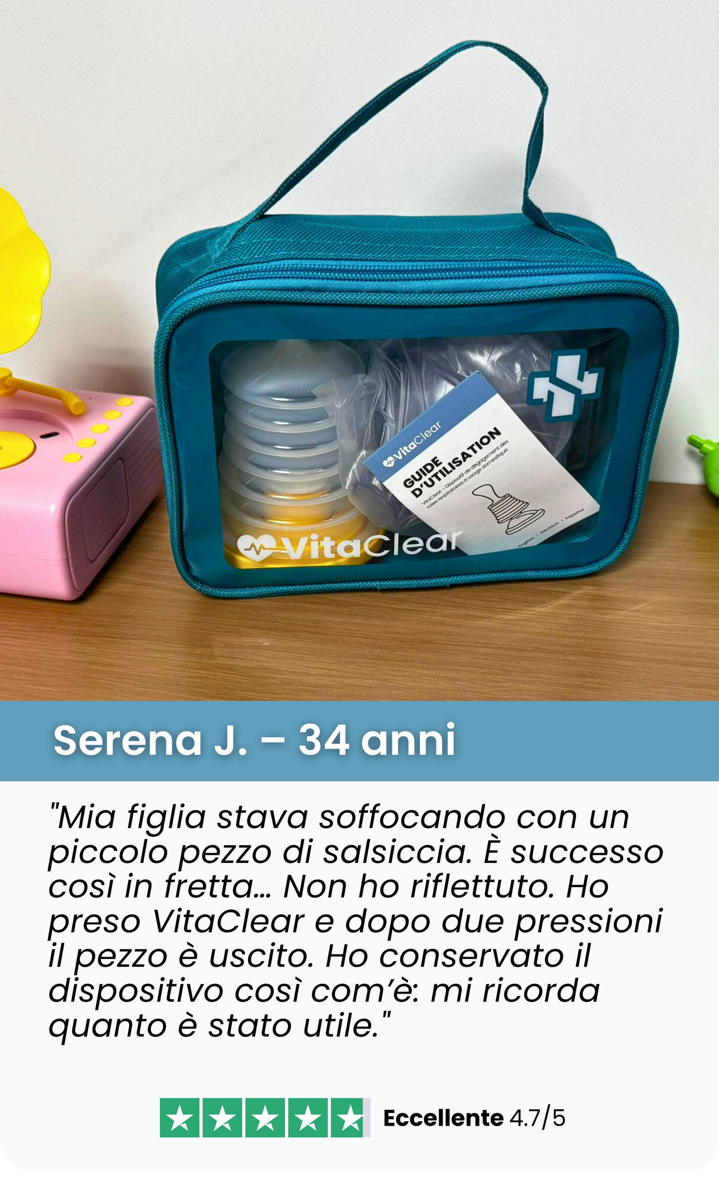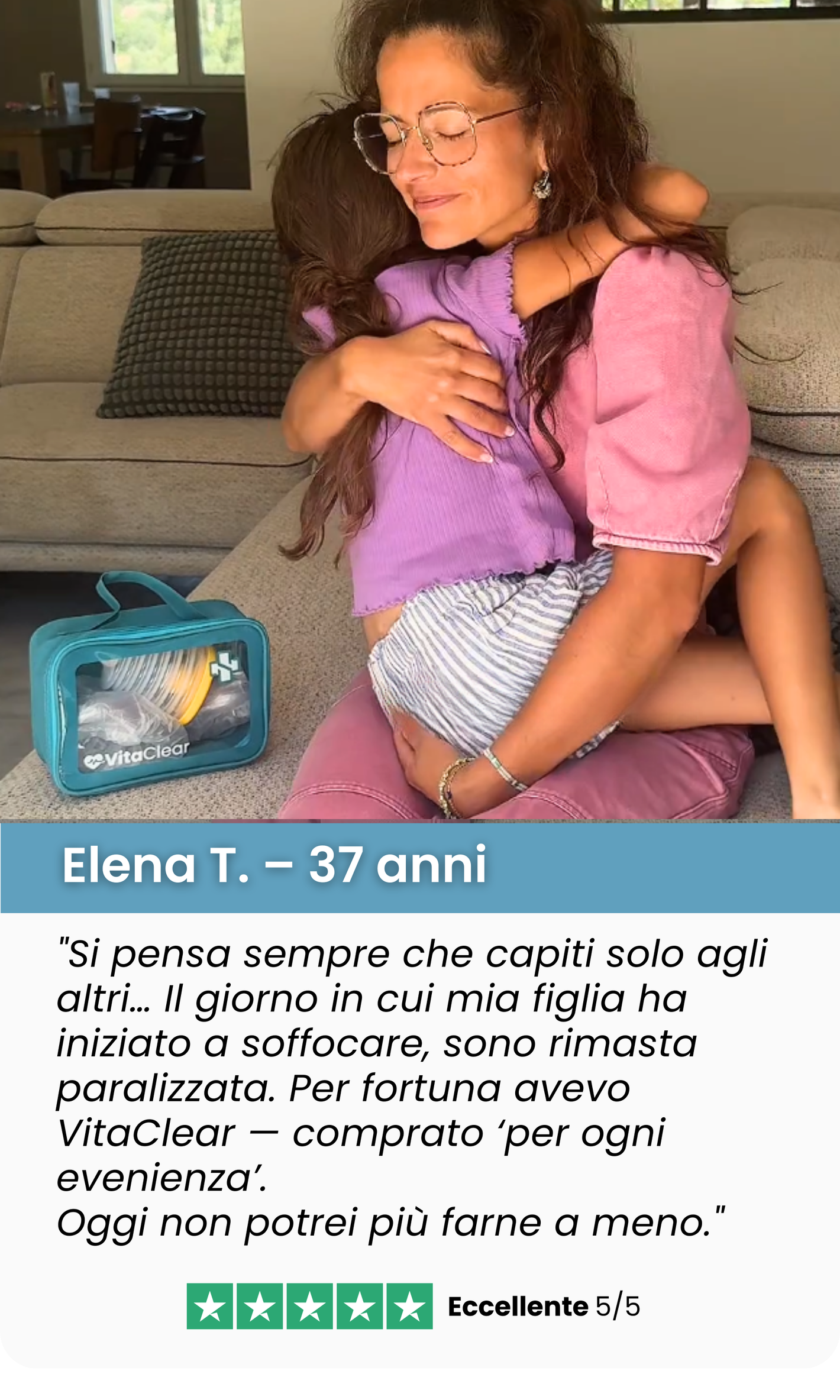La manovra di Heimlich fallisce in circa il 30% dei casi. VitaClear agisce in meno di 3 secondi con un tasso di successo del 98%, anche quando le manovre classiche non funzionano.